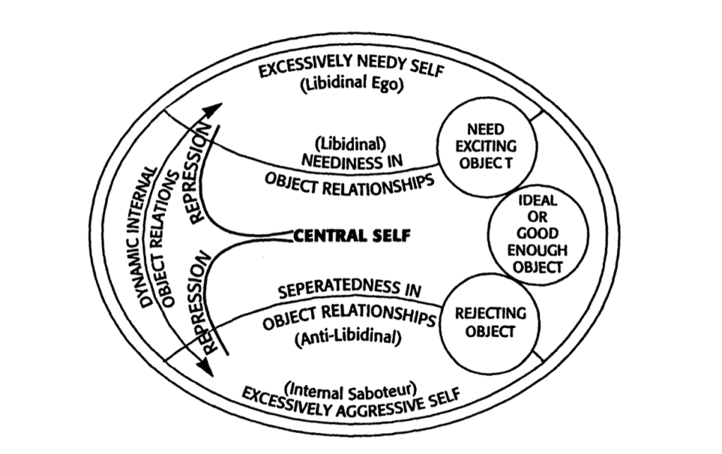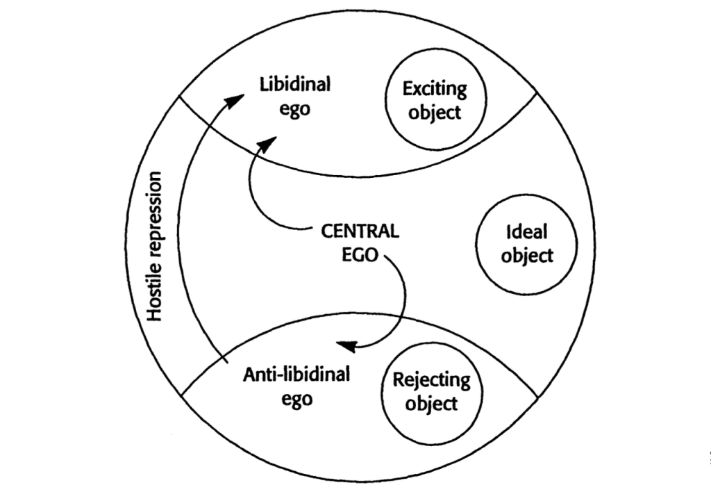 در این مدل، ایگوی مرکزی و اُبژهٔ آرمانیِ آن نمایانگر جنبههای نسبتاً هشیار و عقلانیِ کارکرد روانی هستند. بخشهایی از ایگوی مرکزی، همراه با اُبژههای «بد» درونی (بد به این معنا که بازنماییِ درونیسازیِ تعاملات دردناک با والدیناند) از ایگوی مرکزی جدا و بهدست آن واپس رانده میشوند. در هر مورد، بخشی از ایگو یا خود در نسبت با این اُبژههای گسسته و واپسراندهشده، از بدنهٔ اصلی جدا میشود.