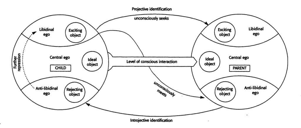 نمودار ۱–۳. سازوکار در اینجا بر تعاملِ همانندسازیهای فرافکنانه و درونفکنانهٔ کودک با والد است، آنگاهکه کودک با ناکامی، اشتیاقِ بیپاسخ یا آسیب روبهرو میشود. نمودار، کودکی را نشان میدهد که در تمنای ارضای نیازهای خویش است و از طریق همانندسازی فرافکنانه، با گرایشهای مشابه در والد یکی میشود. اگر با طرد روبهرو گردد، از طریق همانندسازی درونفکنانه با ناکامیِ نظام ضدلیبیدوییِ والد همانندسازی میکند. در واکنش درونی به این ناکامی، نظام لیبیدوییِ کودک بهواسطهٔ نیروی تازهدمیدهٔ نظام ضدلیبیدوییِ خودِ او بیش از پیش واپس رانده میشود.
