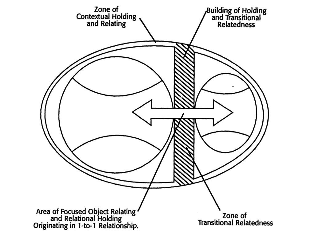 نمودار ۱–۴. نموداری که روابط زمینهای (contextual) و متمرکز (focused) را نشان میدهد. رابطهٔ متمرکز (یا مرکزی یا یکبهیک) درون و از خلال فضای انتقالی روی میدهد. فضای انتقالی هم با رابطهٔ زمینهای و هم با رابطهٔ متمرکز در تماس است و ناحیهای است که این دو را در هم میآمیزد.